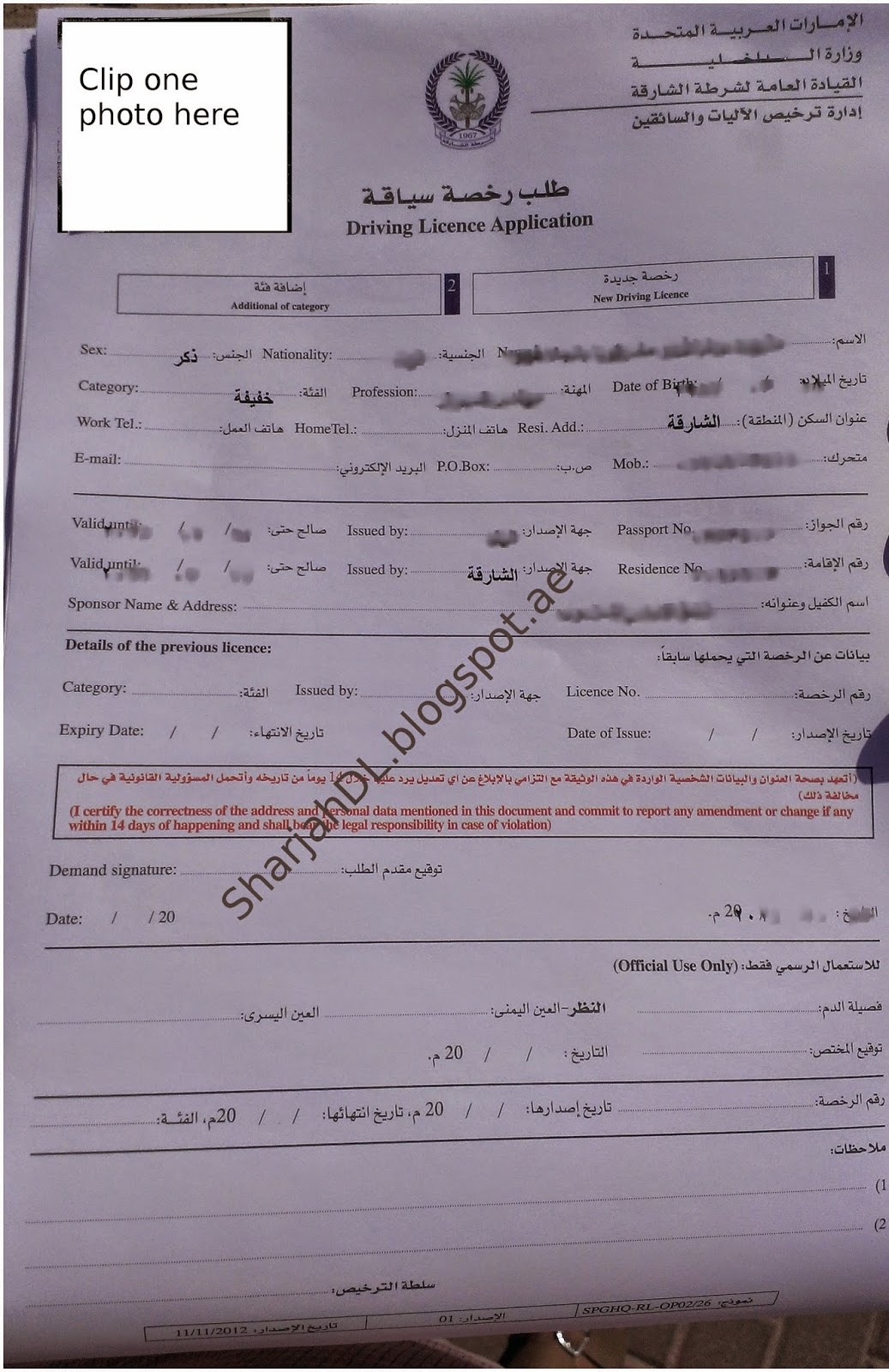 After getting your form, go to a typing centre to fill up. There is one typing centre in the second next bulding of sharjah driving institute (SDI) building, there is a gate inside the SDI compound which leads to the typing centre building.